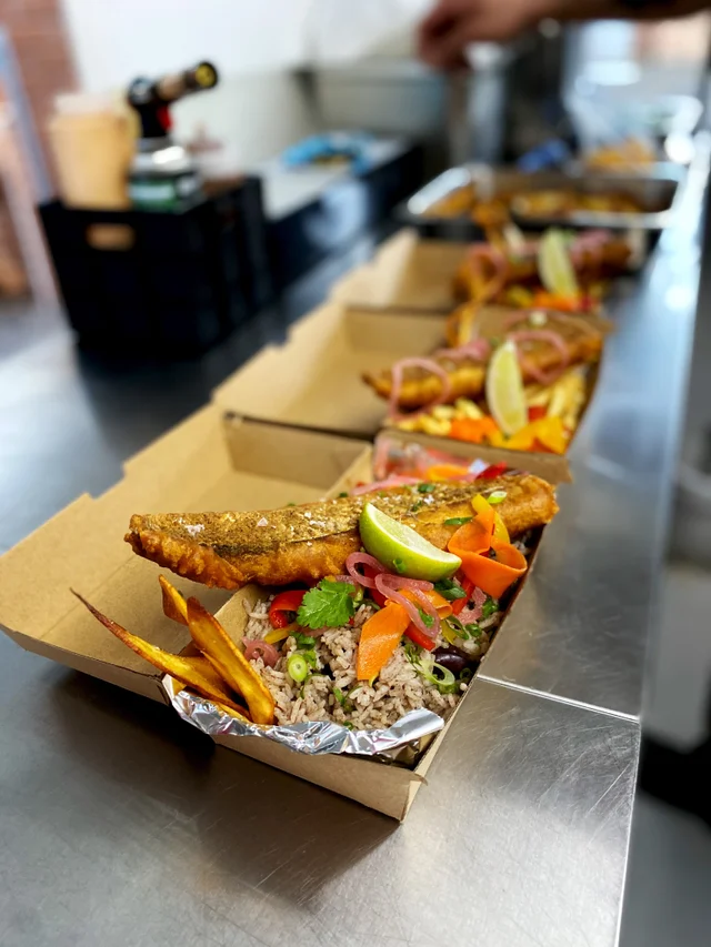 Snapper Escovitch £15.00 Beer Battered Snapper, zesty Jamaican marinated vegetables. Served with rice & peas and fried plantains.